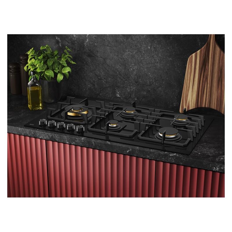 The AEG 90cm 5 Burner Ceramic Glass Gas Cooktop combines powerful performance with sleek, modern design. At the heart of the cooktop is a high-performance 21.6MJ DualFlame brass wok burner, perfect for intense heat and fast stir-fries, while four additional burners offer flexibility for everyday cooking. Crafted with full brass burners, it ensures lasting durability and consistent flame control. The smooth ceramic glass surface not only looks refined but also makes cleaning up spills quick and easy. Cast iron pan supports provide a stable cooking surface and a professional feel, supporting heavy cookware with ease. Whether you?re searing, simmering or boiling, this AEG gas cooktop delivers precise heat and effortless control across all zones. Ideal for those who love to cook with confidence and style, it?s a premium addition to any modern kitchen.