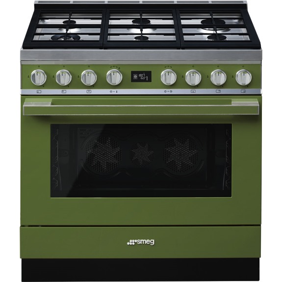 Clean lines and seamless functionality meet in this freestanding cooker from Smeg. Boasting a 126L capacity this oven allow you to cook meals for the whole family, while the Pyrolytic function means there's no need to worry about any spills or messes - you can simply wipe them away later. The 5 shelf heights cater for multiple trays and pots, while the 6 gas burners let you boil water on one burner and stir fry on another. The stylish olive green finish delivers a pop of colour to any modern kitchen.