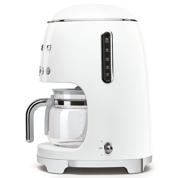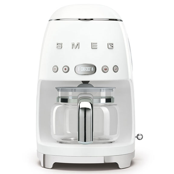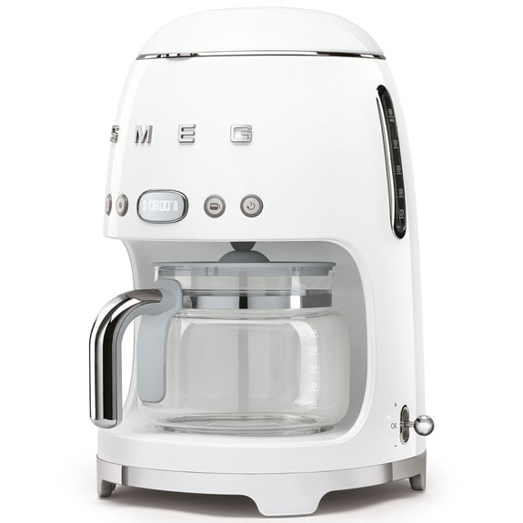 Achieve timeless elegance with the Smeg Retro Style Drip Filter Coffee Machine in White. Featuring a classic white finish and a 10-cup capacity, this coffee machine effortlessly blends into any kitchen decor. The keep warm mode ensures your coffee stays at the perfect temperature for up to 60 minutes, while the LED display with a clock adds a modern touch. With its premium control panel and water level indicator, this coffee machine combines style and functionality for a delightful coffee experience every time.