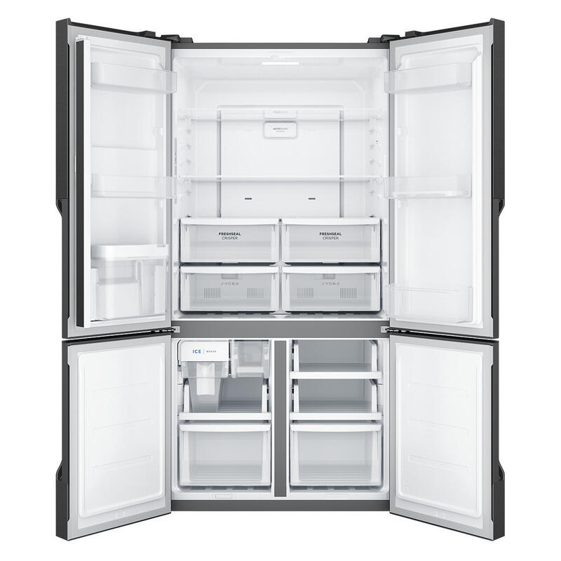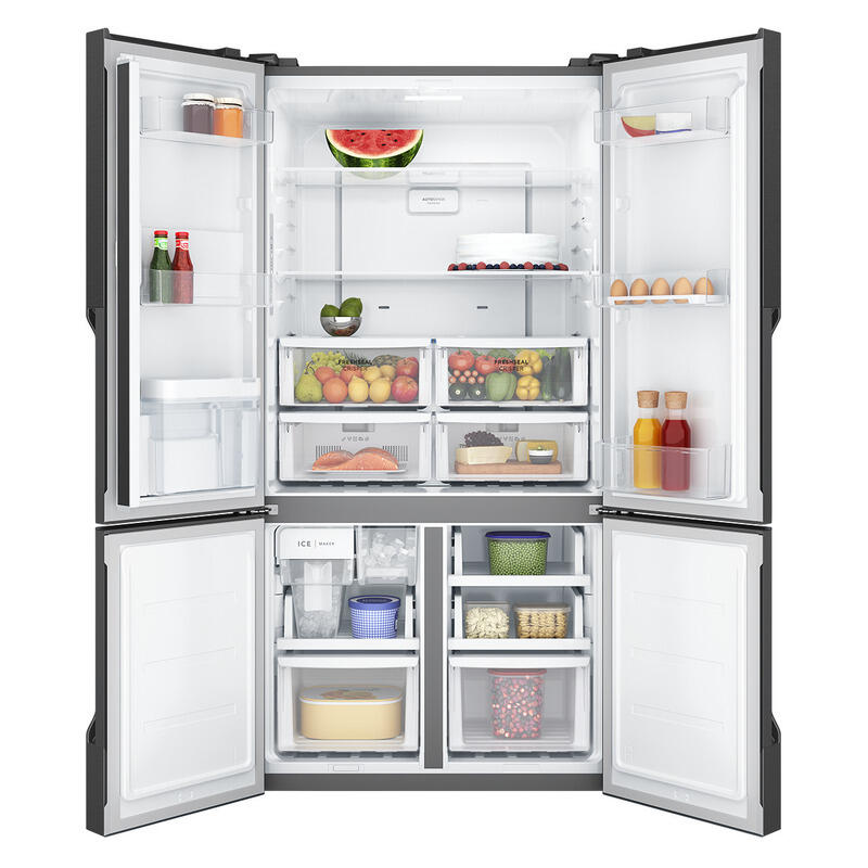 The Westinghouse 564L Quad Door Fridge Freezer with Water Dispenser in Matte Charcoal Black combines generous storage with smart cooling technology, making it a practical and stylish centrepiece for busy family kitchens. Its spacious quad door design helps keep fresh and frozen foods neatly organised, while full width door bins provide plenty of room for large bottles, condiments, and everyday essentials. AutoSense technology automatically adjusts the temperature based on usage patterns, helping maintain optimal cooling conditions while improving energy efficiency, supported by a 4 Star Energy Efficiency rating. For added convenience, the automatic ice maker ensures a steady supply of ice for drinks and entertaining, while the FastIce function quickly boosts ice production when needed. A handy Chill Drink Timer helps prevent forgotten bottles from over chilling by sending an alert when beverages are perfectly cooled. Finished in a sleek matte charcoal black, this fridge freezer offers a contemporary look that pairs beautifully with modern appliances, while delivering reliable Westinghouse performance and thoughtful features designed to make everyday food storage simpler and more efficient