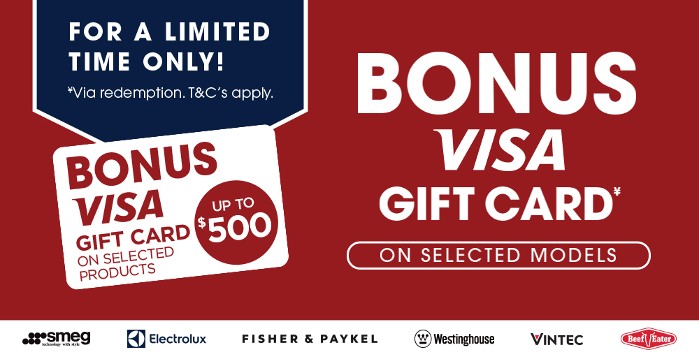 Purchase a selected appliance during the promotional period and receive a Bonus Visa Gift Card up to $500 via redemption at Designer Appliances