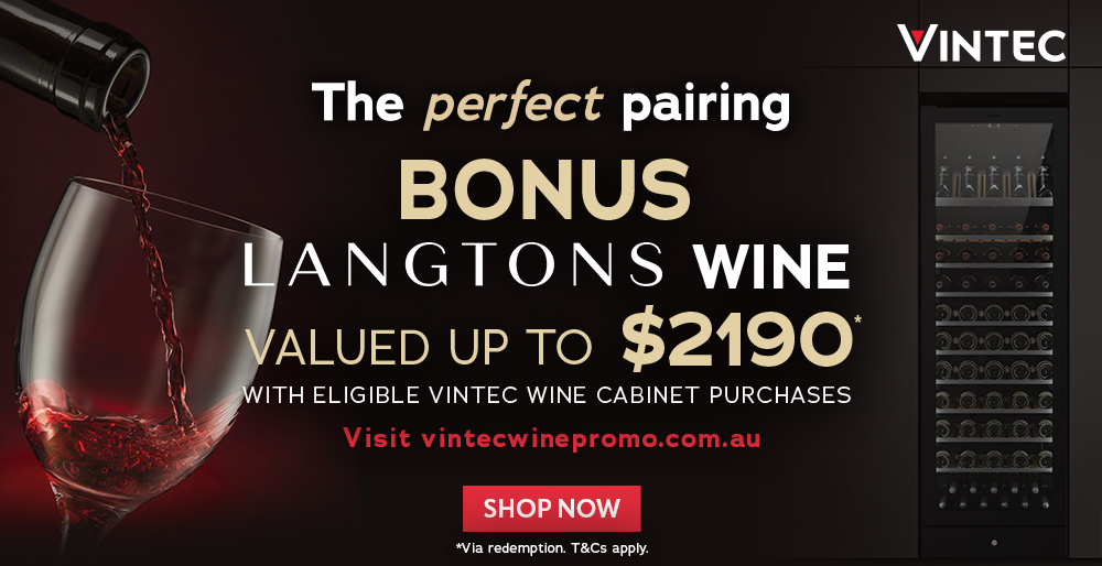 Bonus Langtons Wine valued up to $2190* with eligible Vintec wine cabinet purchases. T&Cs apply. Via redemption.